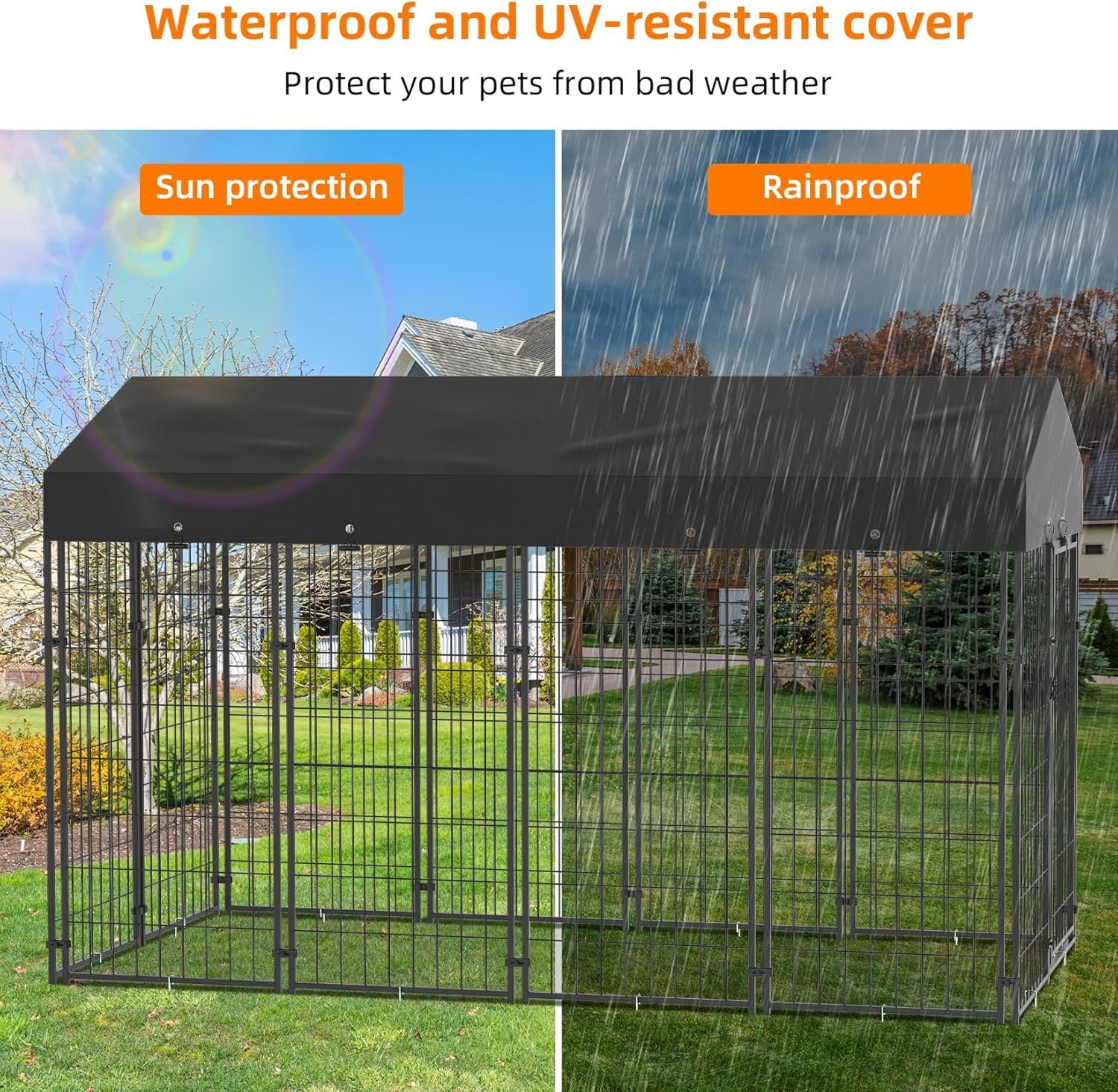 - Weatherproof Comfort: Equipped with a 210D oxford cloth cover, this kennel offers superior protection from wind, rain, and sun, providing a comfortable and secure environment for your pet to enjoy year-round.
